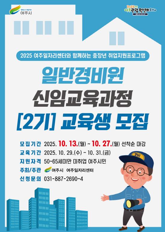 [뉴스앤톡] 여주시는 10월 13일부터 10월 27일까지 베이비부머(중장년) 취업지원을 위한 ‘2025년 일반경비원 신임교육과정 2기 교육생’을 모집한다.