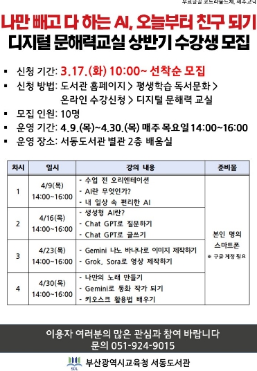 [뉴스앤톡] 부산광역시교육청서동도서관(관장 이진옥)은 오는 4월 9일부터 30일까지 매주 목요일 서동도서관 별관에서 지역 주민 10명을 대상으로 상반기 디지털 문해력 교실 ‘나만 빼고 다 하는 AI, 오늘부터 친구되기’를 운영한다.