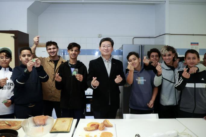 이상일 시장은 호박 케이크를 만드는 프로그램을 듣는 중이던 프랑스 청소년들도 만났다. 한국에 관심이 많은 청소년들이 이 시장을 만나고 싶어한다는 이야기를 듣고 요리실을 방문했다.
