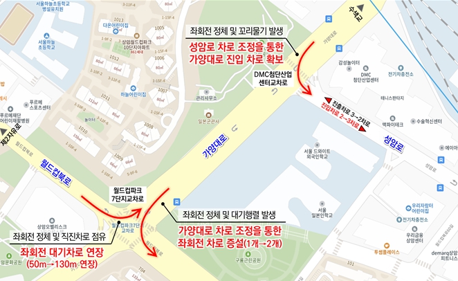 먼저 고양향동지구·덕은지구 등 입주로 교통량이 늘어난 ‘가양대로 축(월드컵파크7단지 교차로~DMC첨단산업센터 교차로)’을 개선한다. 기존 1개였던 좌회전 차로 수를 2개로 늘리고, 대기차로 길이도 50m→130m로 연장해 교차로 꼬리물기와 정체를 해소한다.