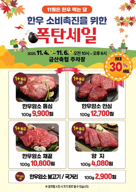 [뉴스앤톡] 한우 농가의 경영 안정을 위한 폭탄세일 행사가 11월 4일부터 11월 6일까지 금산축협 주차장에서 열린다.