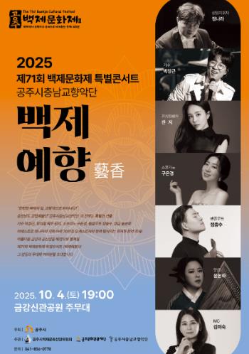 [뉴스앤톡] 공주시충남교향악단은 제71회 백제문화제를 맞아 오는 10월 4일 저녁 7시, 공주 금강신관공원 주무대에서 특별콘서트 ‘백제 예향’을 개최한다고 밝혔다.