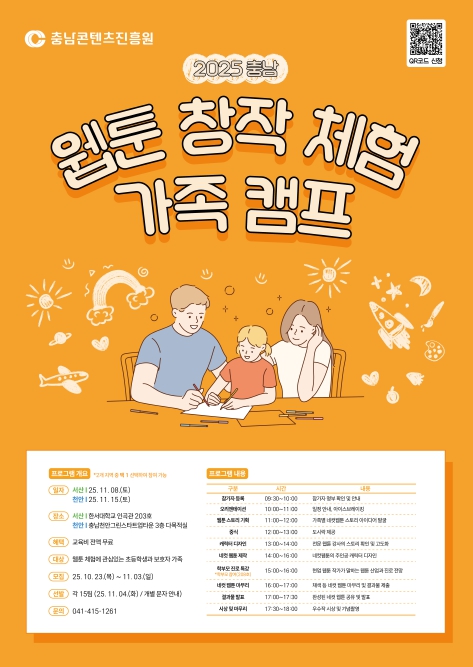 [뉴스앤톡] 충남콘텐츠진흥원은 충남의 웹툰 문화 활성화와 가족이 함께하는 창의적 웹툰 문화체험을 제공하기 위해 ‘2025 충남 웹툰 창작체험 가족 캠프’를 개최한다.