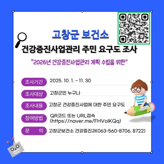 [뉴스앤톡] 고창군보건소가 통합건강증진사업 주민요구도 조사를 11월30일까지 실시하고 있다.