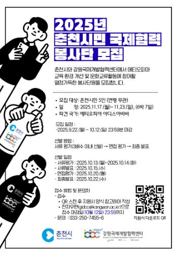 춘천시는 강원국제개발협력센터와 함께 ‘2025 춘천시민 국제협력봉사단’을 창단해 오는 11월 에티오피아 아디스아바바에 파견한다.