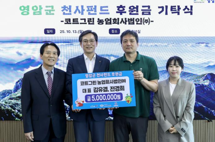 [뉴스앤톡] 코트그린농업회사법인(주)가 13일 영암군청에 천사펀드 500만원, 고향사랑기부금 200만원을 각각 전달했다.