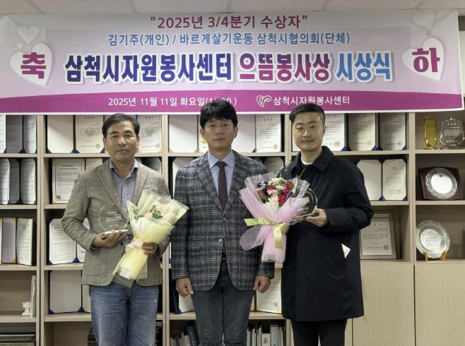 [뉴스앤톡] 삼척시자원봉사센터는 11월 11일 자원봉사센터 회의실에서 ‘2025년 3분기 으뜸봉사상 시상식’을 열고, 지역사회 나눔과 봉사활동에 앞장선 우수 봉사자와 단체를 선정했다.