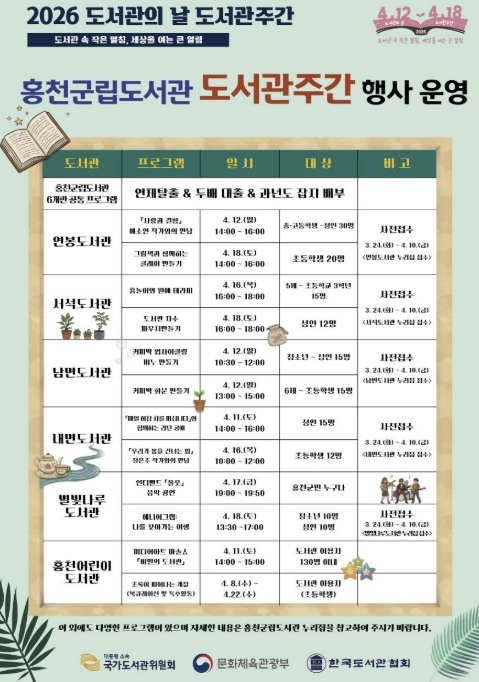 [뉴스앤톡] 홍천 군립 도서관은 2026년 도서관의 날(4월 12일)과 도서관 주간(4월 12일~18일)을 기념해, 4월 한 달간 군민들을 위한 다채로운 독서 문화 프로그램을 운영한다.