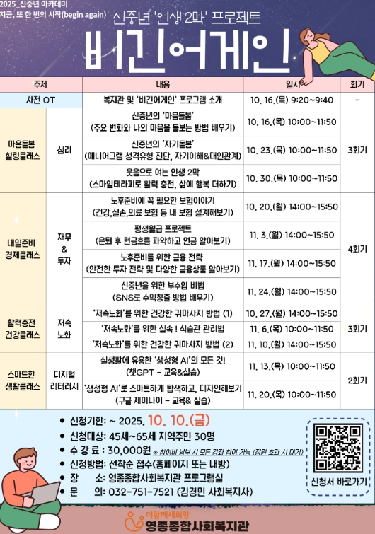 이에 영종종합사회복지관은 실생활에 바로 적용할 수 있는 주제를 중심으로 교육 과정을 마련해 중장년층의 건강한 인생 2막을 지원하고자 한다.