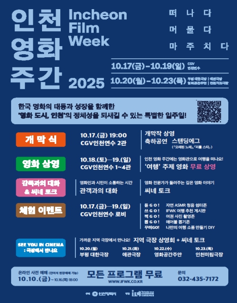 인천시가 주최하고 인천시영상위원회가 주관하는 이번 ‘인천 영화 주간 2025’는 ‘여행’을 주제로 10월 17일부터 23일까지 인천 전역에서 개최되며, 영화 도시 인천의 정체성을 새롭게 발견하고 시민 누구나 함께 즐길 수 있는 복합 영화 축제다.