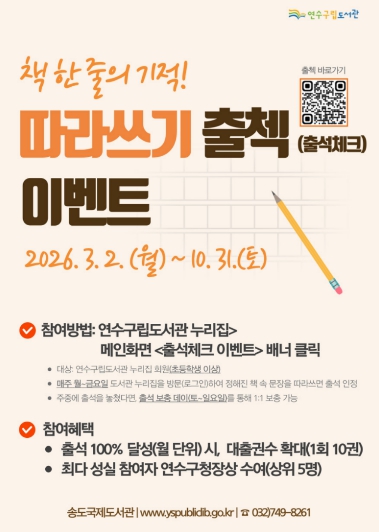 [뉴스앤톡] 연수구립도서관은 구민의 일상 속 독서 습관 형성과 도서관 누리집 이용 활성화를 위해 ‘책 한 줄의 기적! 따라쓰기 출첵 이벤트’를 10월 31일까지 운영한다.