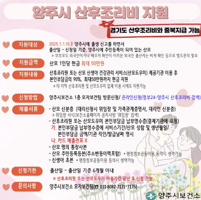 [뉴스앤톡] 양주시보건소가 2025년 1월 1일 출생아부터 관내 출산가정을 대상으로 ‘양주시 산후조리비 지원사업’을 시행하고 있다.