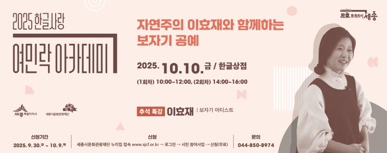 [뉴스앤톡] 세종시문화관광재단(대표이사 박영국)은 ‘2025 한글사랑 여민락 아카데미 추석 특별강좌’를 오는 10월 10일 진행한다.