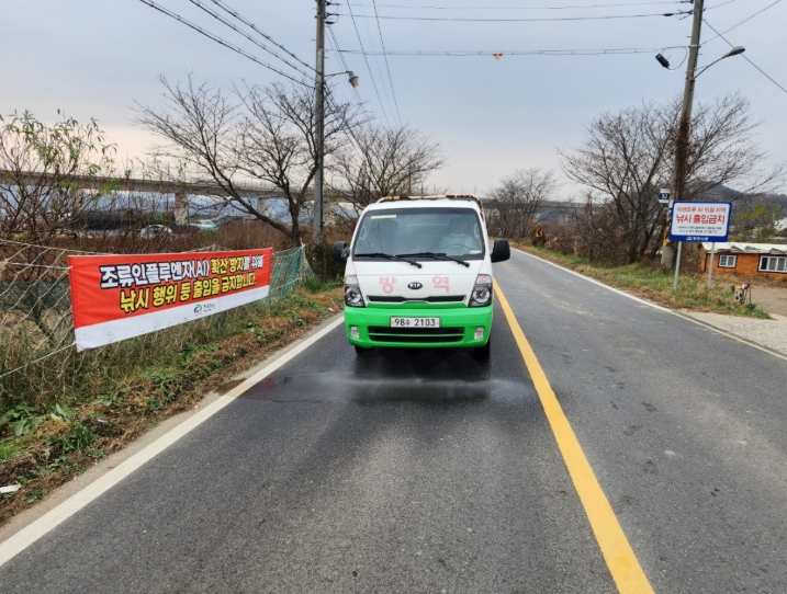 | ▲ 천안시 방역 차량이 AI 유입 차단을 위해 철새도래지 인근 도로를 집중 소독하고 있다. |