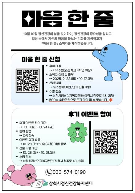 [뉴스앤톡] 삼척시정신건강복지센터는 10월 10일 ‘정신건강의 날’을 기념하고 정신건강 주간(10월 10일 전후 1주간)을 맞아 지역 주민의 정신건강 인식 향상과 마음 돌봄의 중요성을 알리기 위해 ‘마음 한 줄’ 캠페인을 진행한다.