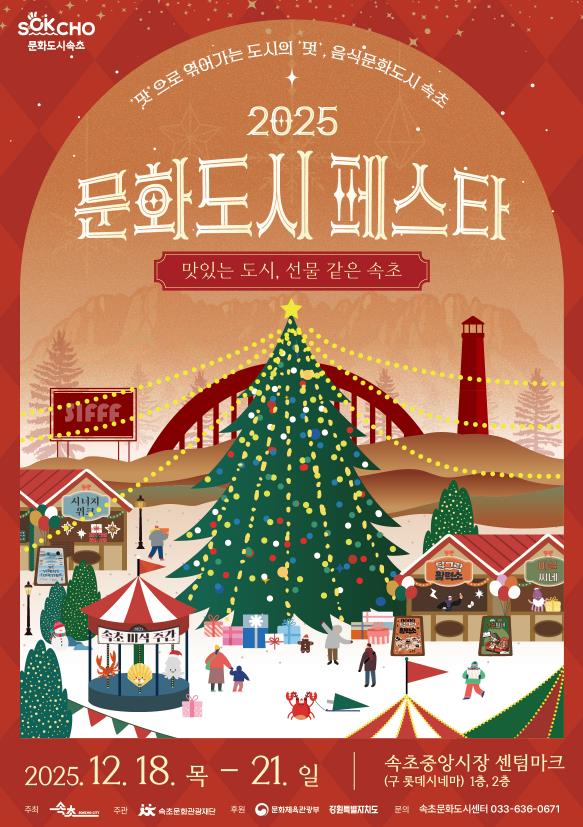 [뉴스앤톡] (재)속초문화관광재단은 속초시의 대한민국 문화도시 1년 차 사업을 마무리하며 오는 12월 18일부터 21일까지 4일간 속초중앙시장 센텀마크(구 롯데시네마) 에서 대한민국 문화도시 성과공유회‘2025 문화도시 페스타’를 개최한다.