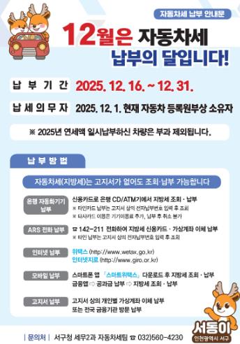 | ▲ 인천 서구, 12월은 자동차세 납부의 달 |