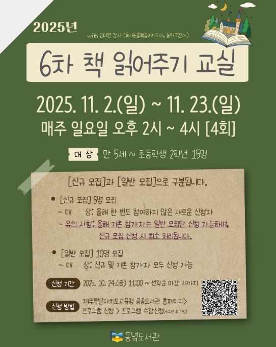 [뉴스앤톡] 제주도교육청 동녘도서관은 11월 2일부터 23일까지 평생교육실에서 ‘2025년 제6차 책 읽어주기 교실’을 운영한다.