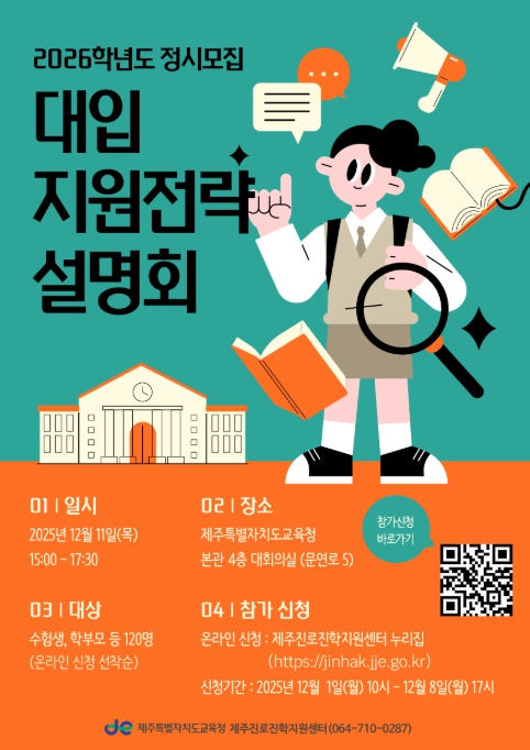 [뉴스앤톡] 제주특별자치도교육청은 12월 11일 오후 3시부터 본관 4층 대회의실에서 ‘2026학년도 대입 정시모집 지원전략 설명회’를 개최한다.