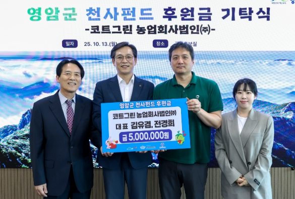 [뉴스앤톡] 코트그린농업회사법인(주)(대표 김유겸·전성희)가 13일 영암군청에 천사펀드 500만원, 고향사랑기부금 200만원을 각각 전달했다.