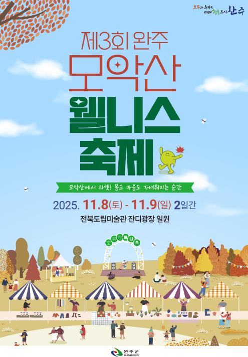 [뉴스앤톡] 완주군은 오는 11월 8일부터 9일까지 전북도립미술관 야외광장 일원에서 웰빙, 건강, 행복을 주제로 ‘제3회 완주 모악산 웰니스 축제’를 개최한다.