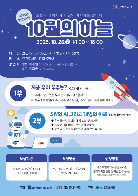 김봉석 탐라도서관장은 “이번 10월의 하늘 강연을 통해 아이들과 청소년들이 과학을 쉽고 재미있게 접하며, 창의적인 생각과 무한한 미래 꿈을 키울 수 있는 계기가 되길 바란다”며, 시민들의 많은 관심과 참여를 당부했다.