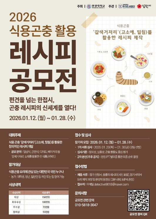 [뉴스앤톡] 남원시와 원광대학교 RISE 사업단은 식용 곤충에 대한 인식 전환과 관심 제고를 위해 식용 곤충 활용 레시피 공모전을 개최한다.