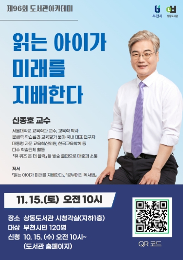 [뉴스앤톡] 부천시는 11월 15일 오전 10시 부천시립상동도서관 시청각실에서 인공지능(AI)·디지털 시대 학습 경쟁력의 핵심인 문해력을 주제로 ‘제96회 도서관 아카데미’를 연다. 이번 강연은 ‘읽는 아이가 미래를 지배한다’의 저자이자 서울대학교 교육학과 교수인 신종호 교수를 초청해 진행한다.