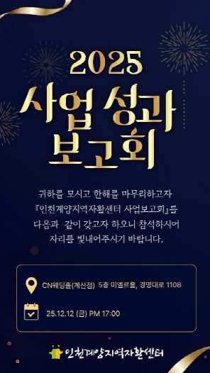 [뉴스앤톡] 인천계양지역자활센터(센터장 한경주)는 2025년 한 해 동안 추진한 자활사업의 성과를 공유하고 참여주민을 격려하기 위해 ‘2025년 사업성과 보고회’를 오는 12월 12일 오후 5시 CN웨딩홀 계산점에서 개최한다고 밝혔다.