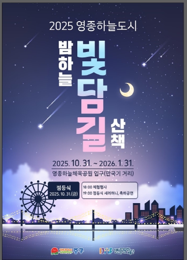 [뉴스앤톡] (재)인천중구문화재단(이사장 김정헌)은 올해 10월 31일부터 오는 2026년 1월 31일까지 3개월간 야간 경관조명 ‘2025 영종 빛 축제 - 영종하늘도시 밤하늘 빛담길’을 운영한다고 밝혔다.