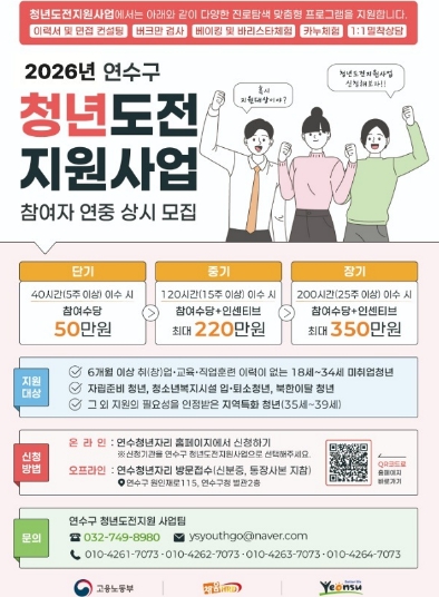 [뉴스앤톡] 연수구는 청년들의 경제 활동과 노동시장 진입을 돕기 위해 ‘2026년 청년도전지원사업’ 참여자를 모집한다.