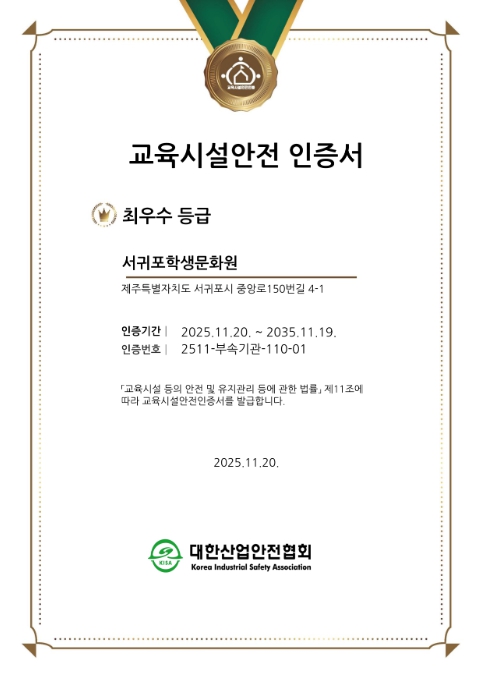 강정림 원장은 “이번 인증은 서귀포학생문화원이 시설 관리와 안전 문화 확산에 지속적으로 힘써온 결과”라며 “앞으로도 이용자의 안전을 최우선으로 삼아 더욱 안전하고 쾌적한 공간을 제공하겠다”고 말했다.