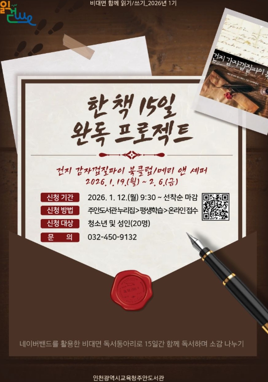 [뉴스앤톡] 인천광역시교육청주안도서관은 청소년과 성인을 대상으로 2026년 비대면 함께 읽기·쓰기'한 책 15일 완독 프로젝트'를 운영한다.