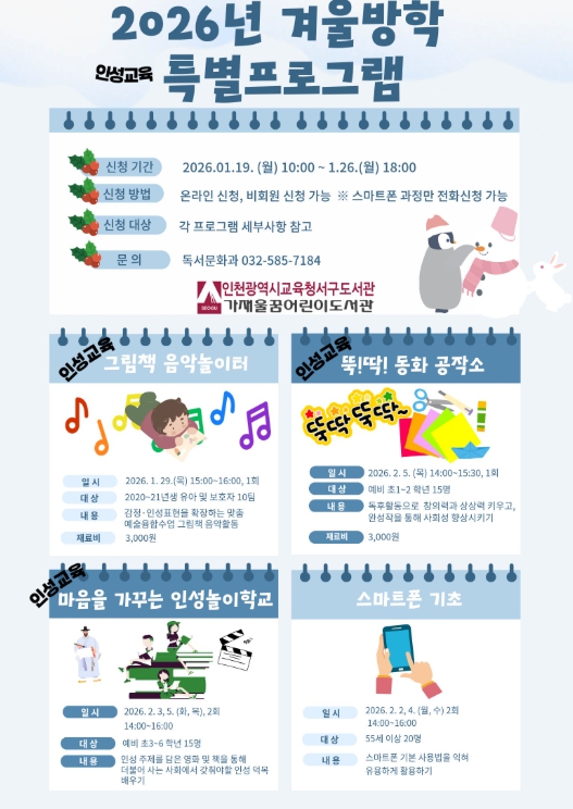 인천광역시교육청서구도서관, ‘2026년 겨울방학 특별프로그램’ 학습자 모집