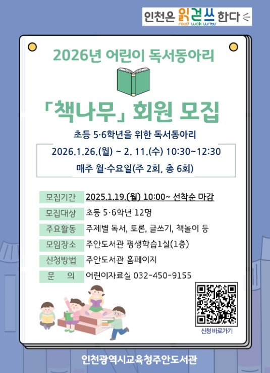 [뉴스앤톡] 인천광역시교육청주안도서관은 예비 초등 5·6학년 학생을 대상으로 하는 독서동아리 '책나무' 회원을 모집한다.