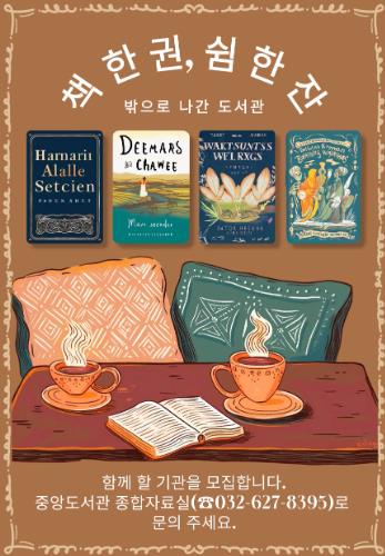 ‘책 한 권 쉼 한 잔’ 사업에 대한 자세한 사항은 중앙도서관 종합자료실로 문의하면 된다.