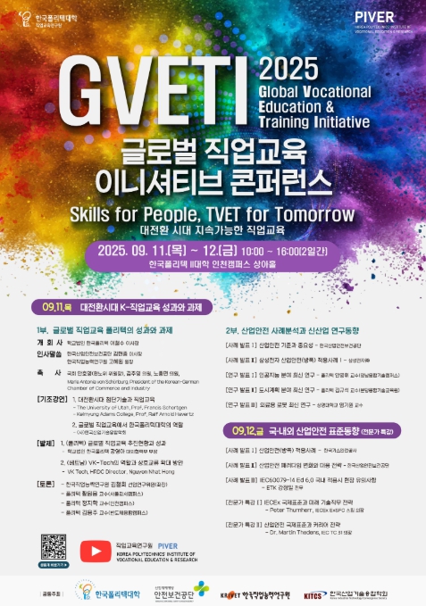 [뉴스앤톡] 고용노동부 한국폴리텍대학은 한국산업안전보건공단, 한국직업능력연구원, 한국산업기술융합학회와 함께 ‘글로벌 직업교육 이니셔티브(GVETI) 콘퍼런스’를 11일부터 2일간 인천캠퍼스에서 개최한다고 밝혔다.