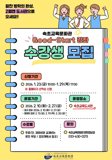 [뉴스앤톡] 속초교육문화관(관장 이윤전)은 2월 10일부터 27까지 10일간 속초교육도서관에서 예비 초·중·고등학생, 초등 가족을 대상으로 ‘2026년 굿 스타트(Good-Start) 강좌’를 운영한다.