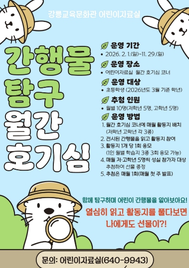 [뉴스앤톡] 강릉교육문화관(관장 박기현)은 2026년 2월부터 11월까지 초등학생을 대상으로 간행물 탐구 ‘월간 호기심’을 운영한다.
