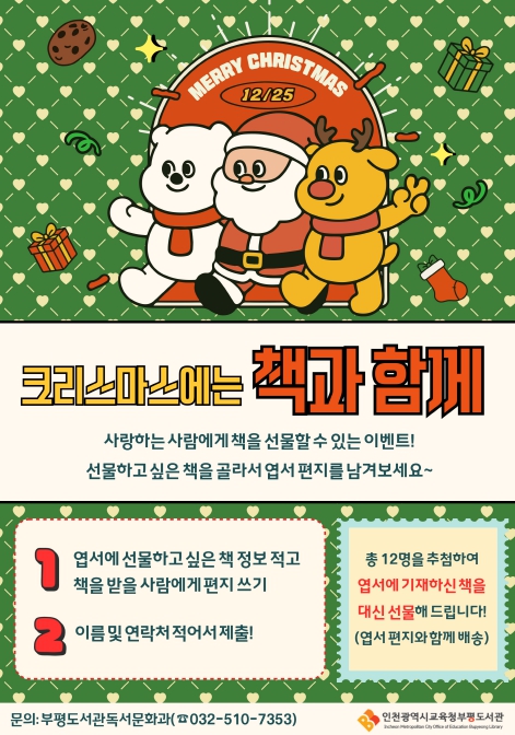 [뉴스앤톡] 인천광역시교육청부평도서관은 지역 서점과 협력한 책동네산책 프로젝트의 일환으로 ‘크리스마스에는 책과 함께’ 이벤트를 12월 14일까지 운영한다고 밝혔다.