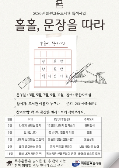 [뉴스앤톡] 화천교육도서관은 오는 3월부터 11월까지 깊이 있는 독서문화의 확산을 위해 2026년 특색사업 ‘홀홀, 문장을 따라’를 운영한다.