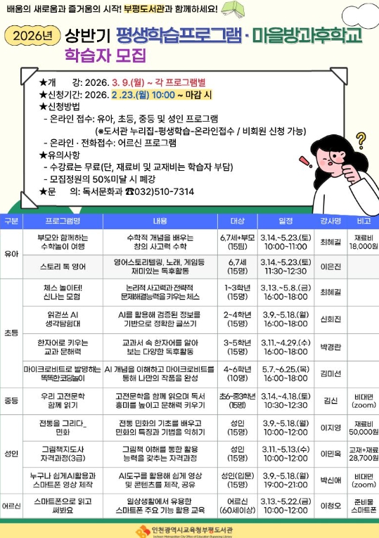 [뉴스앤톡] 인천광역시교육청부평도서관은 지역 주민에게 배움의 즐거움을 전하고 성장의 기회를 제공하기 위하여, 23일부터 ‘상반기 정규 평생학습프로그램 및 마을방과후학교’학습자를 모집한다.