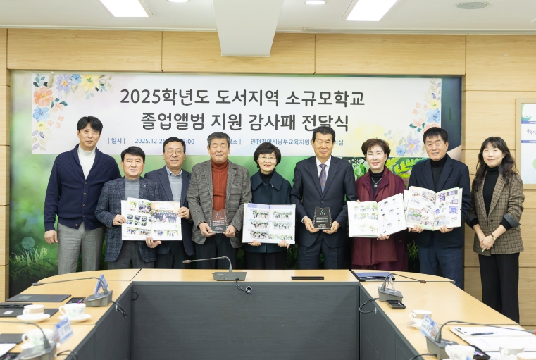 [뉴스앤톡] 인천남부교육지원청은 26일 남부 도서학교 졸업앨범 무료 제작에 협력한 인천사진앨범인쇄협동조합, 푸르미재단, 기호일보와 함께 전수식 및 감사패 전달식을 개최했다.