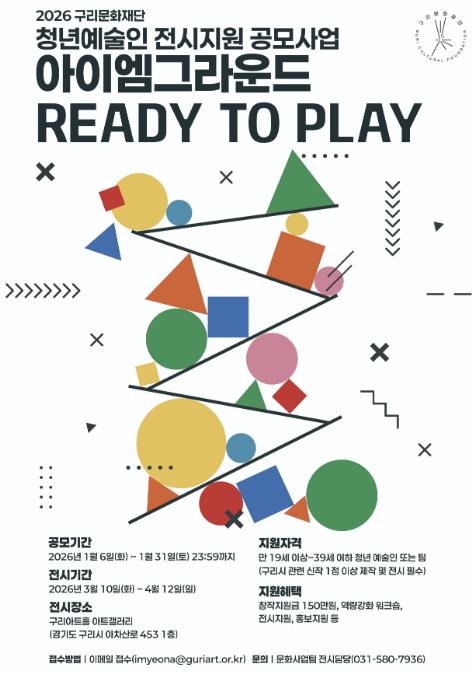 [뉴스앤톡] (재)구리문화재단은 청년 예술인의 도약과 성장을 지원하기 위한 청년 정책 플랫폼 사업의 일환으로, 2026년 청년 예술인 전시지원 공모사업 '아이엠 그라운드, Ready to Play'에 참여할 예술인을 1월 6일부터 1월 31일까지 모집한다.