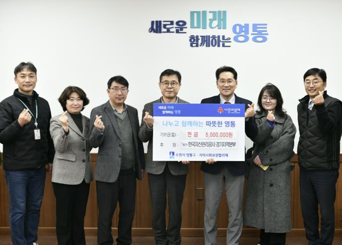 [뉴스앤톡] 수원시 영통구는 지난 24일 한국자산관리공사 경기지역본부에서 관내 경제적으로 어려움을 겪는 이웃을 위해 성금 500만 원을 기부했다고 밝혔다.