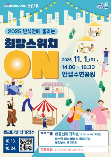 [뉴스앤톡] 대전 유성구는 11월 1일 지족동 안샘수변공원에서 ‘2025 노은3동 반석천에 울리는 희망스위치 ON’ 행사를 개최한다.