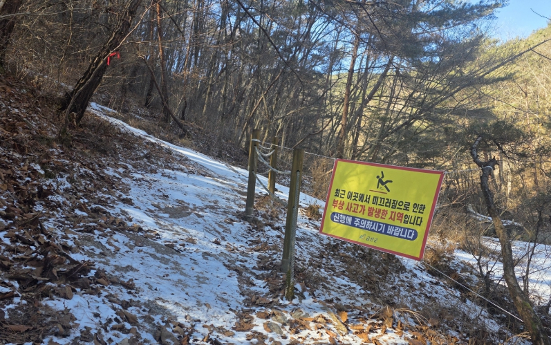 군은 십이폭포 중 운옥폭포(제9폭포)에 미끄럼 주의 현수막을 설치했다.