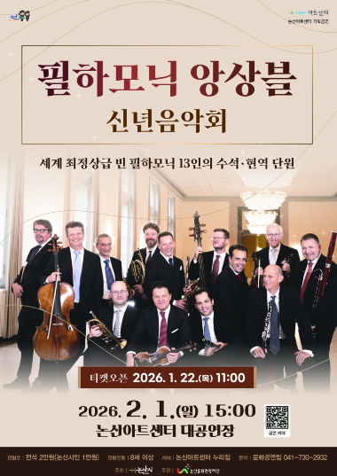 [뉴스앤톡] (재)논산문화관광재단은 오는 2월 1일 오후 3시, 논산아트센터 대공연장에서‘필하모닉 앙상블 신년음악회’를 개최한다고 전했다.