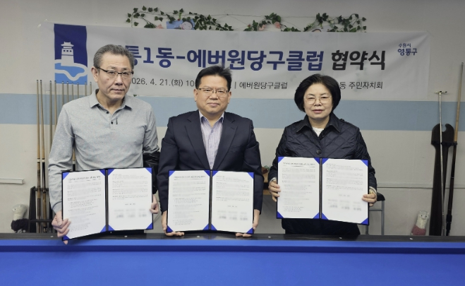 [뉴스앤톡] 수원시 영통구 영통1동 행정복지센터와 영통1동 주민자치회는 지난 21일, 주민자치센터 프로그램의 다양성과 전문성을 강화하기 위해 관내 민간체육시설인 에버원당구클럽과 업무협약을 체결했다.