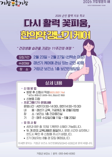 [뉴스앤톡] 거창군 보건소는 중·장년층의 신체적·정신적 변화로 인한 갱년기 증상을 예방하고 스스로 건강을 관리할 수 있는 역량을 강화하기 위해 ‘2026년 한의약 갱년기 건강관리 프로그램’ 참여자를 모집한다.